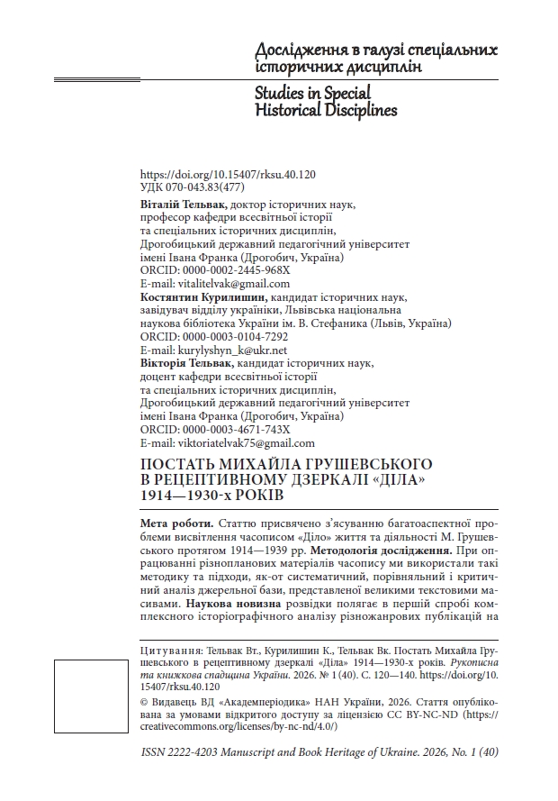 | 6. |  | Тельвак В., Курилишин К., Тельвак В. Постать Михайла Грушевського в рецептивному дзеркалі "Діла" 1914–1930-х років