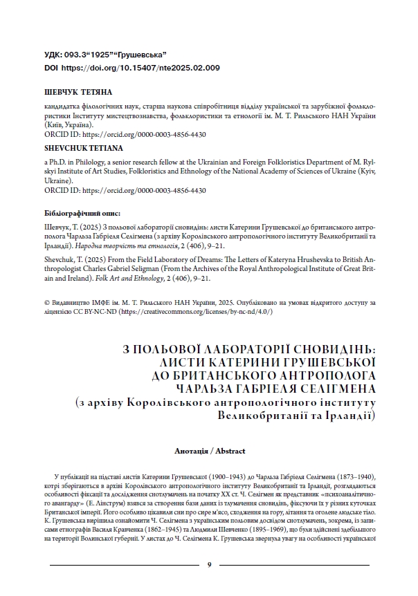 | 4. |  | Шевчук Т. З польової лабораторії сновидінь: листи Катерини Грушевської до британського антрополога Чарльза Габріеля Селігмена (з архіву Королівського антропологічного інституту Великобританії та Ірландії)