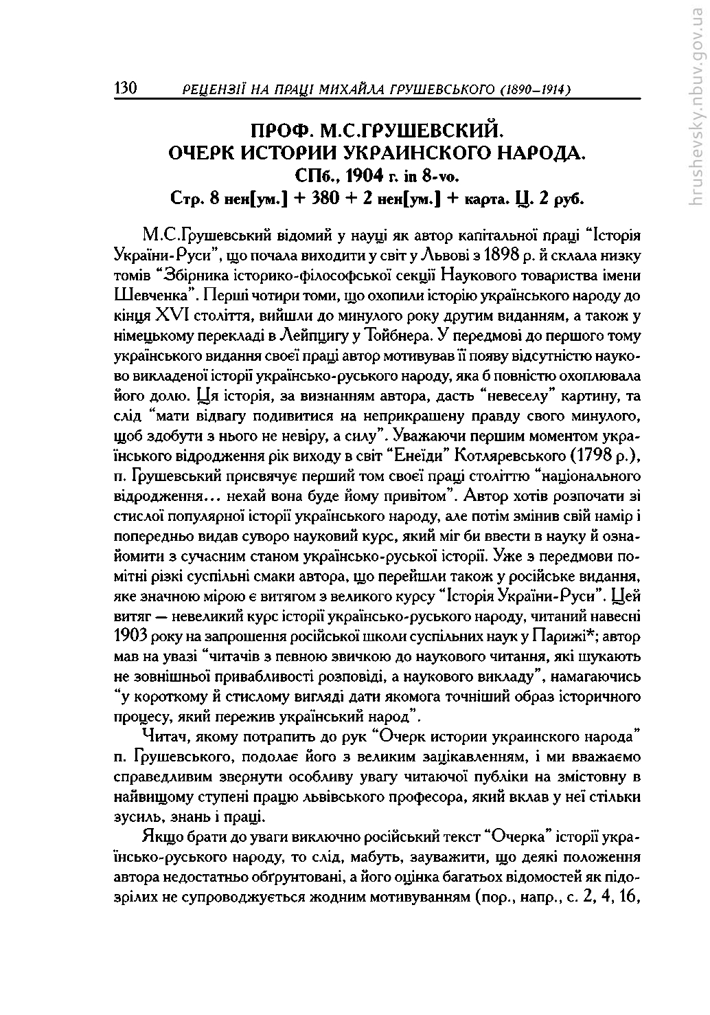 | 1. |  | Сторожев В. [Рец. на кн.:] Проф. М. С. Грушевский. Очерк истории украинского народа. СПб., 1904. in 8-vo. Стр. 8 нен[ум.] + 380 + 2 нен[ум.] + карта. Ц. 2 руб. // Твори : у 50 т.. - Львів : Видавництво "Світ", 2015. Т.46. Кн. 1. - С. 130–133 |  Бібліотека  |