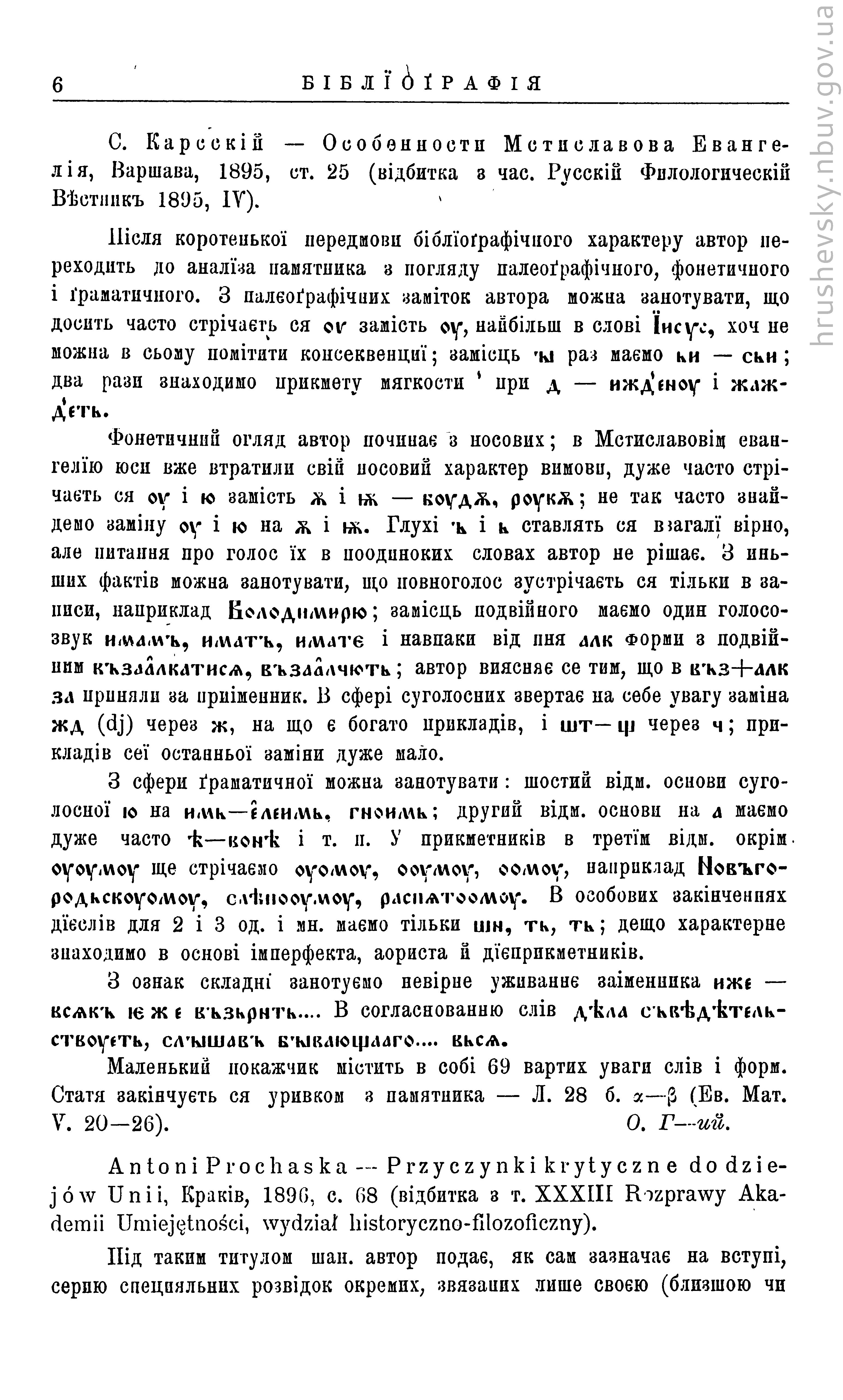 | 10. |  | М. Грушевський Antoni Prосhaska Przyczynki krytyczne do dziejów Unii, Краків, 1896, c. 68 (відбитка з т. XXXIII Rozprawy Akademii Umiejętności, wydział historyczno-filozoficzny) // Записки товариства імені Шевченка : вид-во, присвяч. науці і письменству укр.-рус. народу. - Львів : Накладом Т-ва імені Шевченка, 1897. - Т. 18, кн. 4. - С. 6–9 |  Бібліотека
