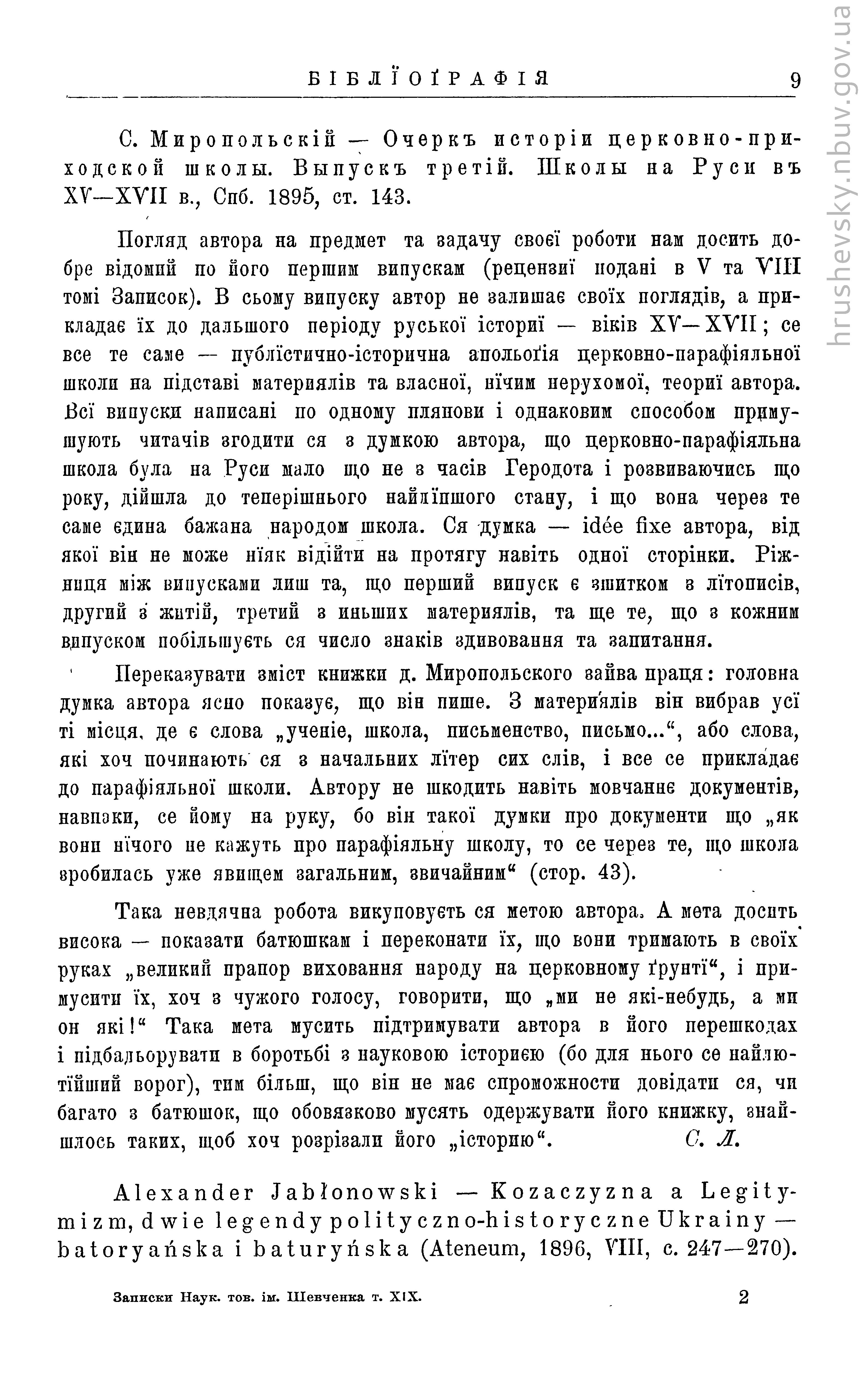 | 6. |  | М. Грушевський Alexander Jabłonowski. Kozaczyzna а Legitymizm, dwie legendy polityczno-historyczne Ukrainy – batoryańska i baturyńska (Ateneum, 1896, VIII с. 247–270); А. Стороженко. Сводъ данныхъ о Янѣ Орышевскомъ, запорожскомъ гетманѣ временъ Стефана Баторія (Киевская Старина, 1897, I с. 125–145) // Записки товариства імені Шевченка : вид-во, присвяч. науці і письменству укр.-рус. народу. - Львів : Накладом Т-ва імені Шевченка, 1897. - Т. 19, кн. 5. - С. 9–11 |  Бібліотека  |