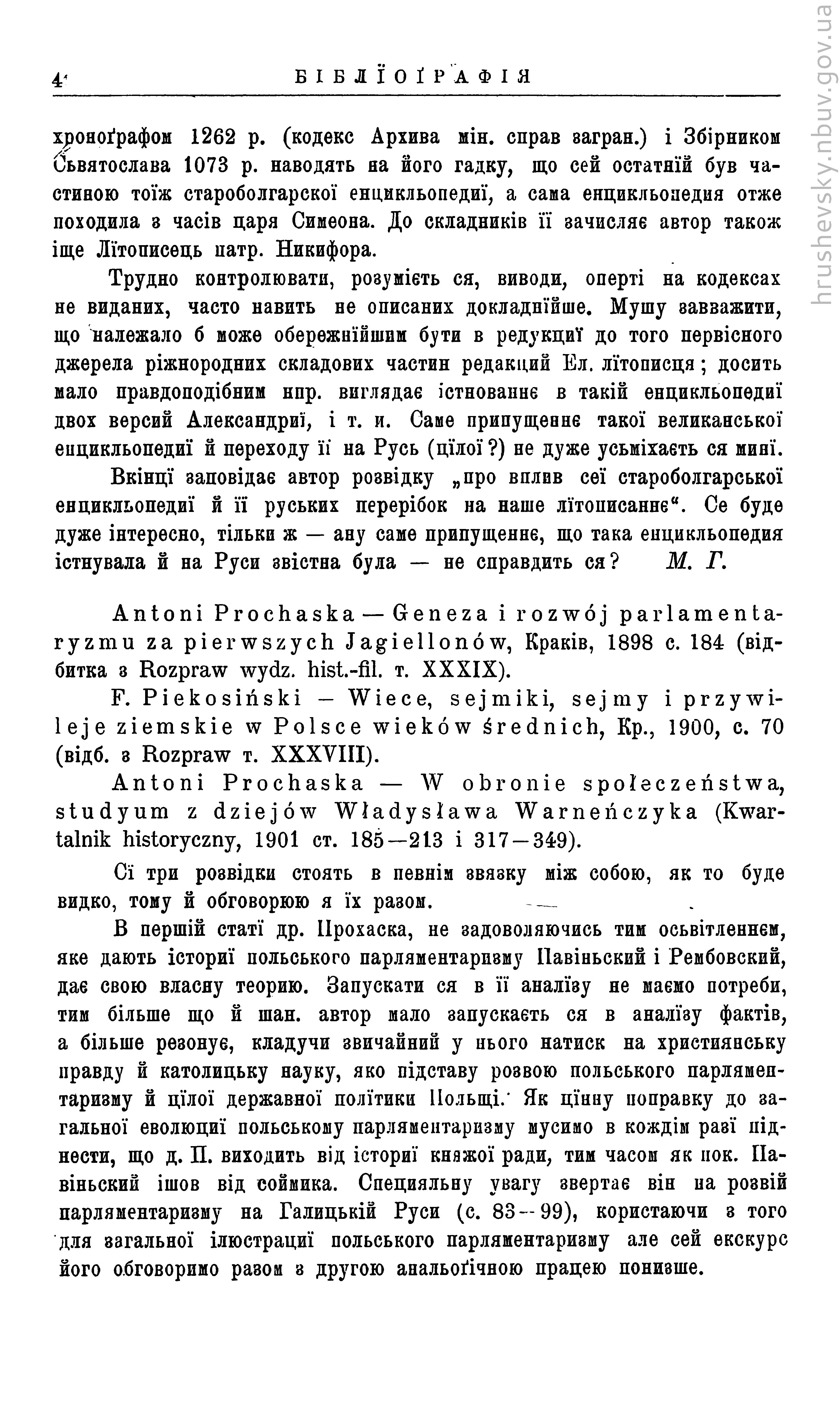 | 7. |  | Грушевський М[ихайло] Antoni Prochaska. Geneza і rozwój parlamentaryzmu za pierwszych Jagiellonów, Краків, 1898 c. 184 (відбитка з Rozpraw wydz. hist.-fil. т. XXXIX).; F. Piekosiński Wiece, sejmiki, sejmy i przywileje ziemskie w Polsce wieków średnich, Kp., 1900, c. 70 (відб. з Rozpraw т. XXXVIII).; Antoni Prochaska W obronie społeczeństwa, studyum z dziejów Władysława Warneńczyka (Kwartalnik historyczny, 1901 ct. 185–213 i 317 – 349) // Записки товариства імені Шевченка : вид-во, присвяч. науці і письменству укр.-рус. народу. - Львів : Накладом Т-ва імені Шевченка, 1902. - Т. 45, кн. 1. - С. 4–7 |  Бібліотека  |