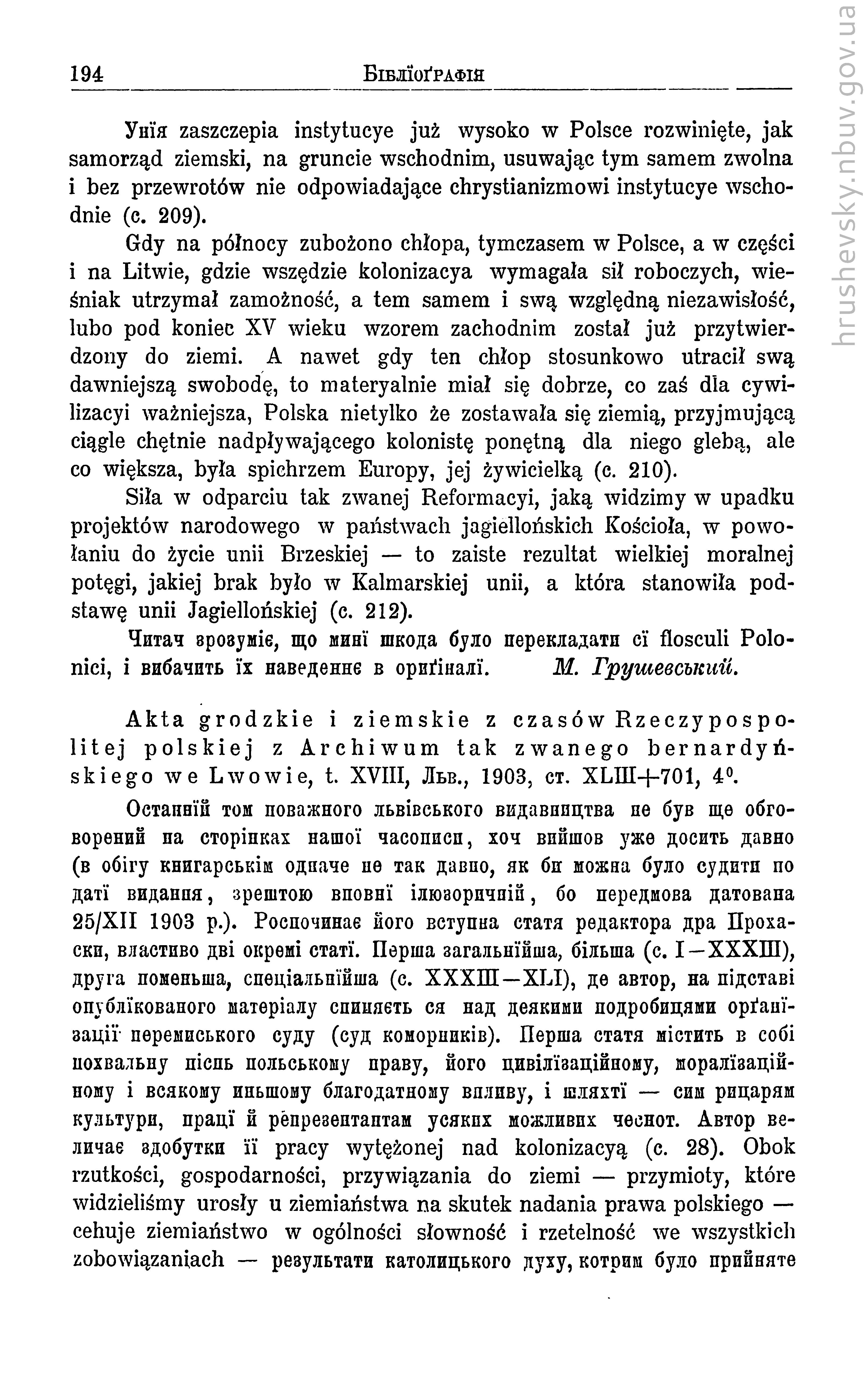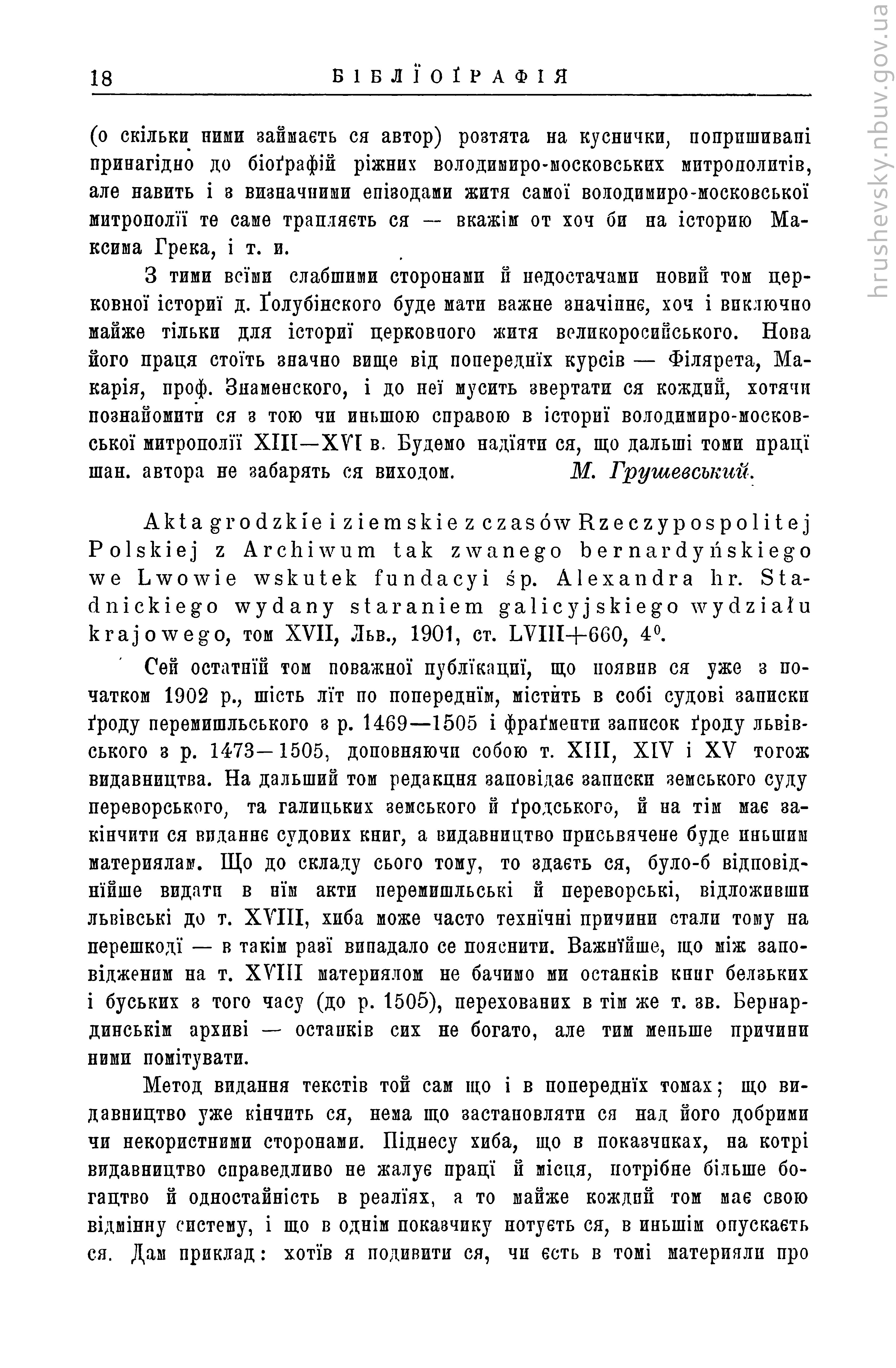 | 3. |  | Грушевський М[ихайло] Akta grodzkie i ziemskie z czasów Rzeczypospolitej polskiej z Archiwum tak zwanego bernardyńskiego we Lwowie, t. XVIII, Льв., 1903, ст. ХLIIІ+701, 4° // Записки товариства імені Шевченка : вид-во, присвяч. науці і письменству укр.-рус. народу. - Львів : Накладом Т-ва імені Шевченка, 1907. - Т. 76, кн. 2. - С. 194–195 |  Бібліотека  |