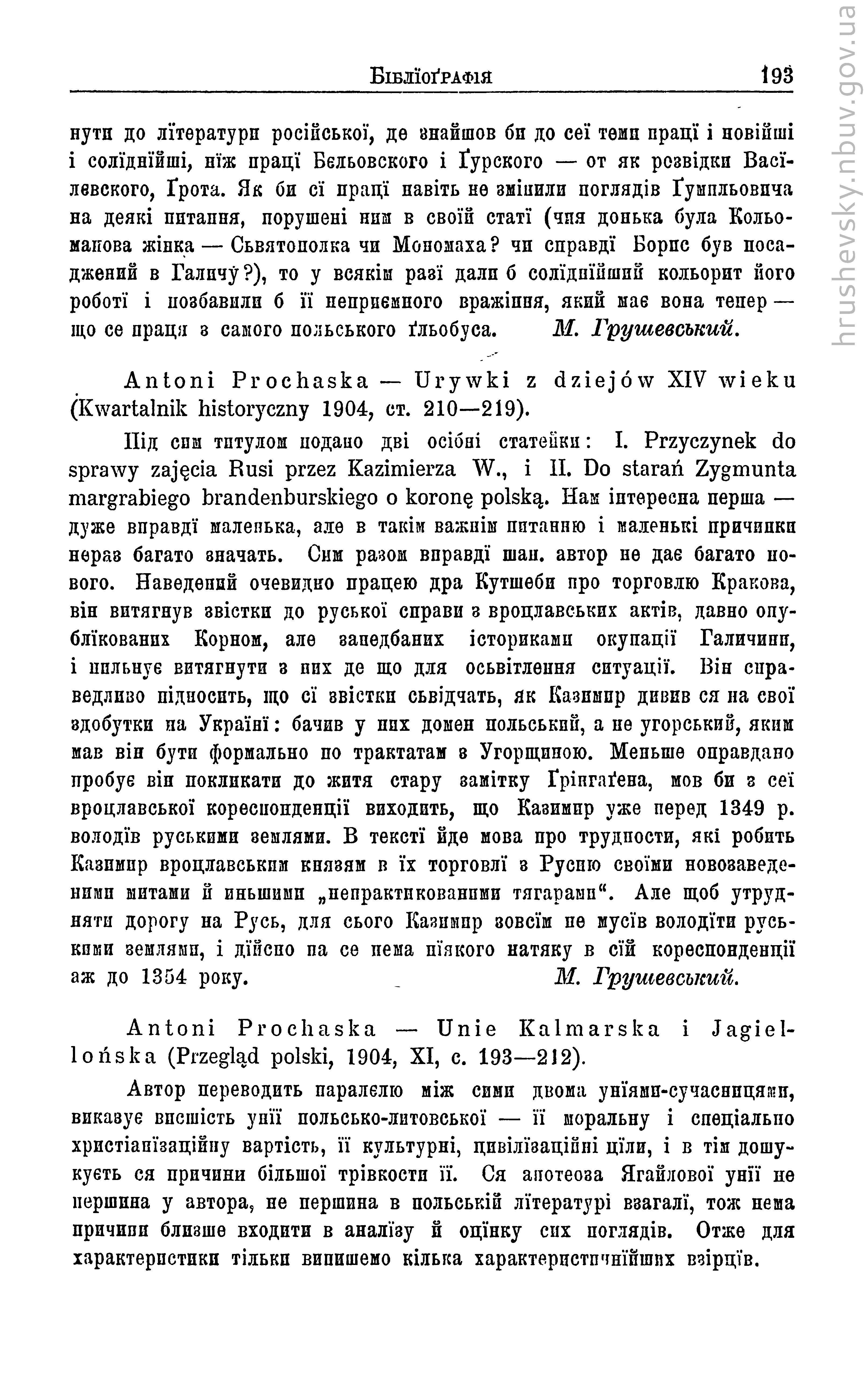 | 8. |  | Грушевський М[ихайло] Antoni Prochaska. Unie Kalmarska i Jagiellońska (Przegląd polski, 1904, XI, c. 193–212) // Записки товариства імені Шевченка : вид-во, присвяч. науці і письменству укр.-рус. народу. - Львів : Накладом Т-ва імені Шевченка, 1907. - Т. 76, кн. 2. - С. 193–194 |  Бібліотека  |