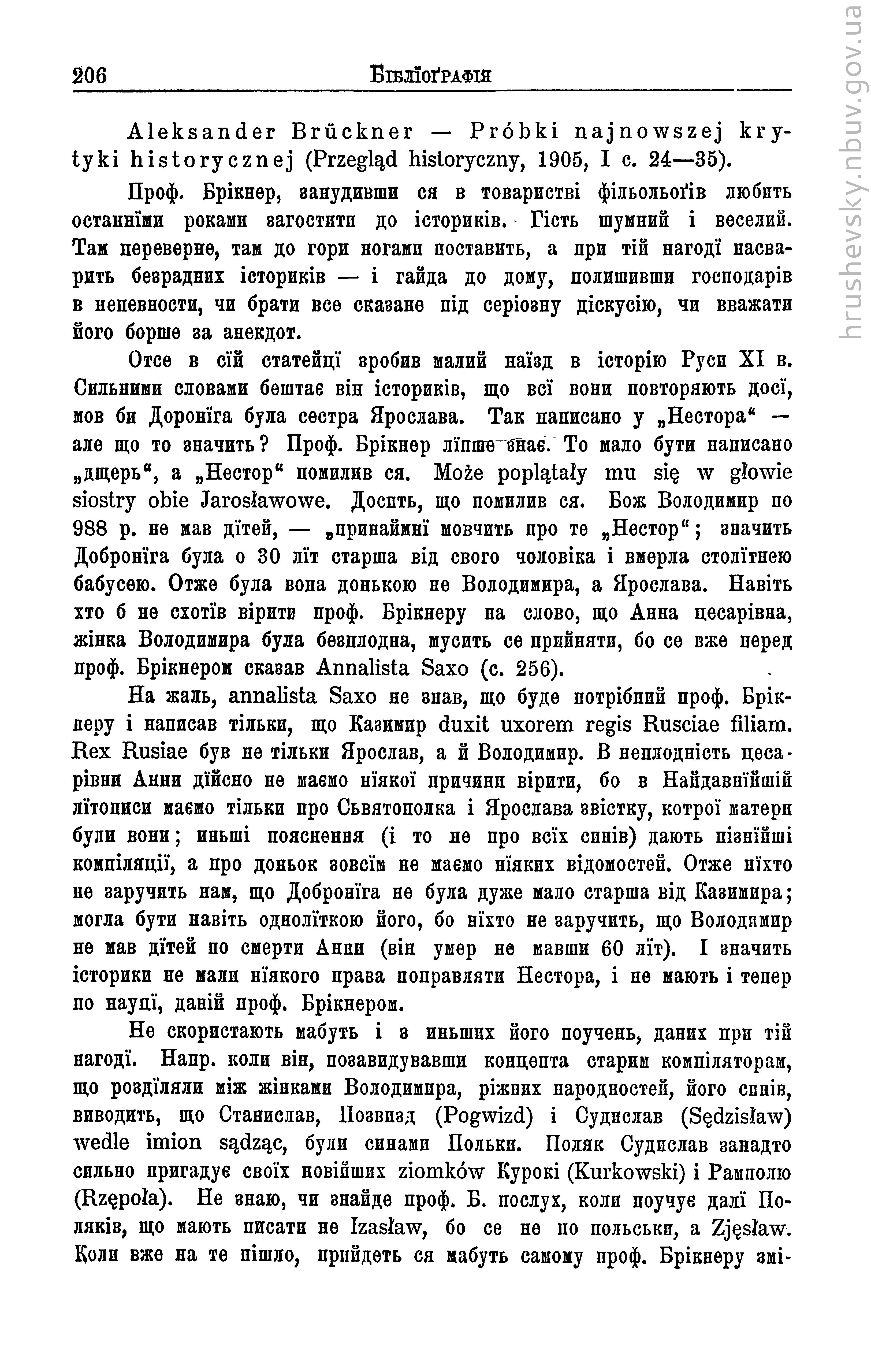 | 5. |  | Грушевський М[ихайло] Aleksander Brückner. Próbki najnowszej krytyki historycznej (Przegląd historyczny, 1905, I c. 24–35) // Записки товариства імені Шевченка : вид-во, присвяч. науці і письменству укр.-рус. народу. - Львів : Накладом Т-ва імені Шевченка, 1907. - Т. 77, кн. 3. - С. 206–207 |  Бібліотека  |