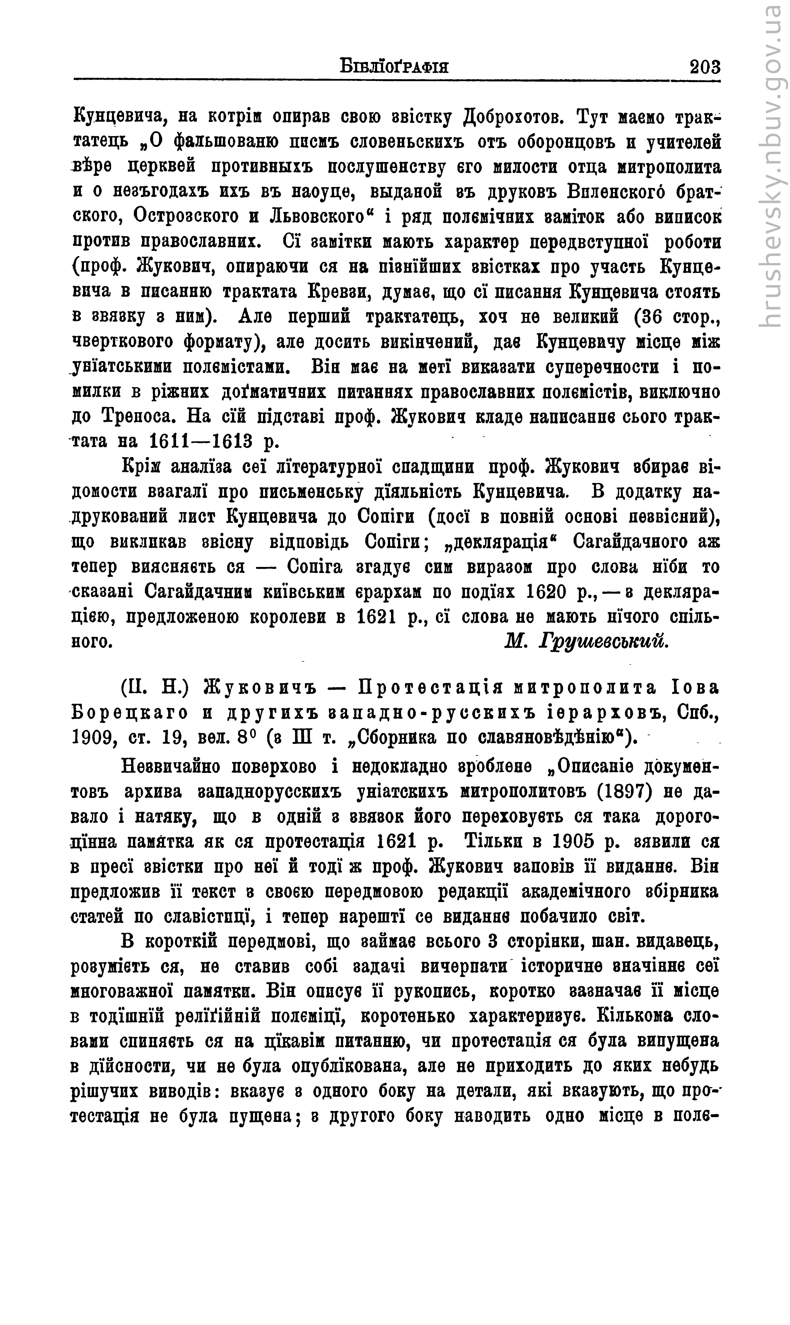 | 2. |  | Грушевський М[ихайло] (П. Н.) Жуковичъ. Протестація митрополита Іова Борецкаго и другихъ западно-русскихъ іерарховъ, Спб., 1909, ст. 19, вел. 8° (в ІІІ т. "Сборника но славяновѣдѣнію") // Записки товариства імені Шевченка : вид-во, присвяч. науці і письменству укр.-рус. народу. - Львів : Накладом Т-ва імені Шевченка, 1910. - Т. 94, кн. 2. - С. 203–204 |  Бібліотека  |