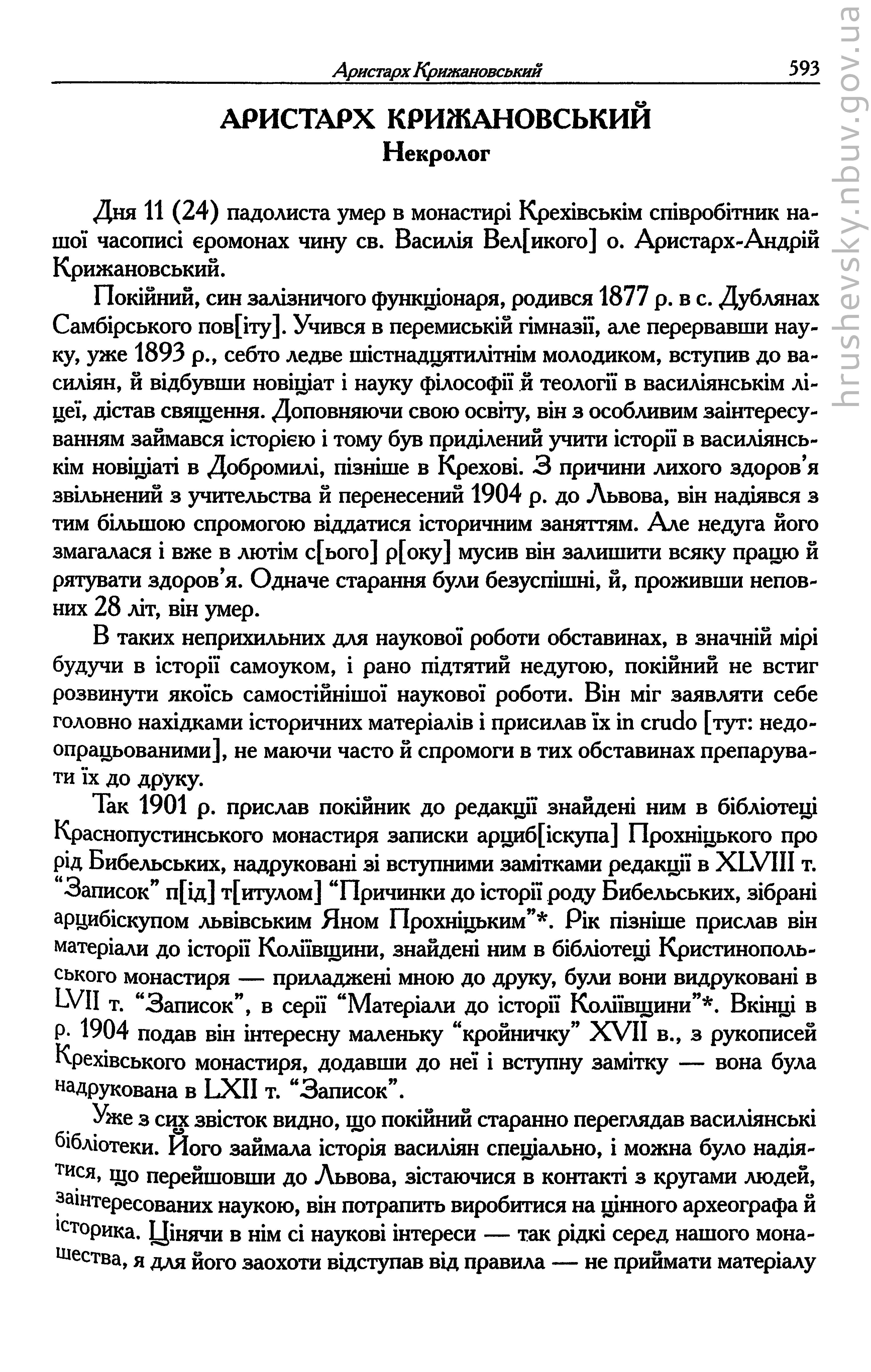 | 6. |  | Грушевський М. С. Аристарх Крижановський. Некролог // Твори : у 50 т.. - Львів : Видавництво "Світ", 2005. Т. 7. - С. 593 - 594 |  Бібліотека  |
