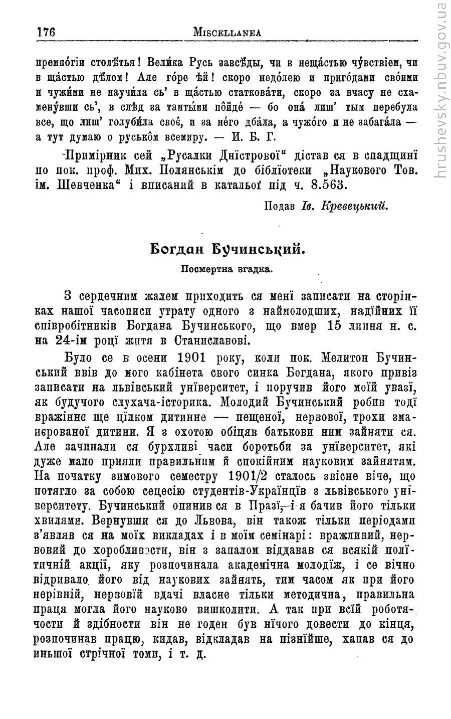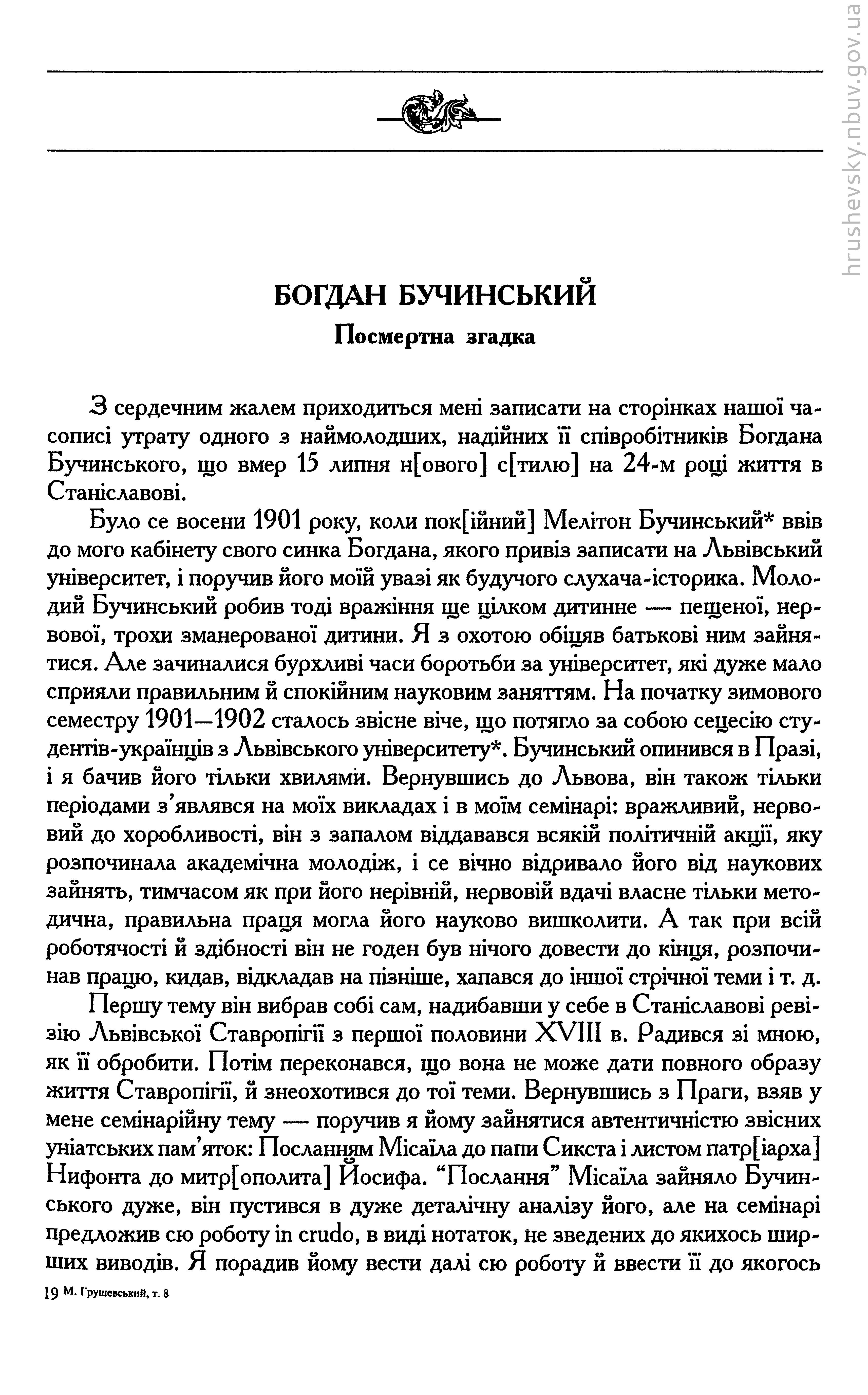 | 8. |  | Грушевський М. Богдан Бучинський, посмертна згадка // Записки товариства імені Шевченка : вид-во, присвяч. науці і письменству укр.-рус. народу. - Львів : Накладом Т-ва імені Шевченка, 1907. - Т. 78, кн. 4. - С. 176-178 |  Бібліотека  |