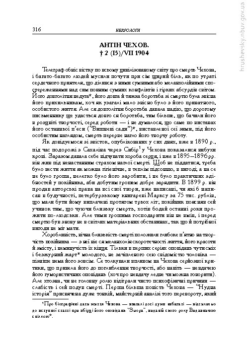 | 4. |  | Грушевський М. С. Антін Чехов. † 2 (15) / VII 1904 // Твори : у 50 т.. - Львів : Видавництво "Світ", 2008. Т.11. - С. 316 - 317 |  Бібліотека  |