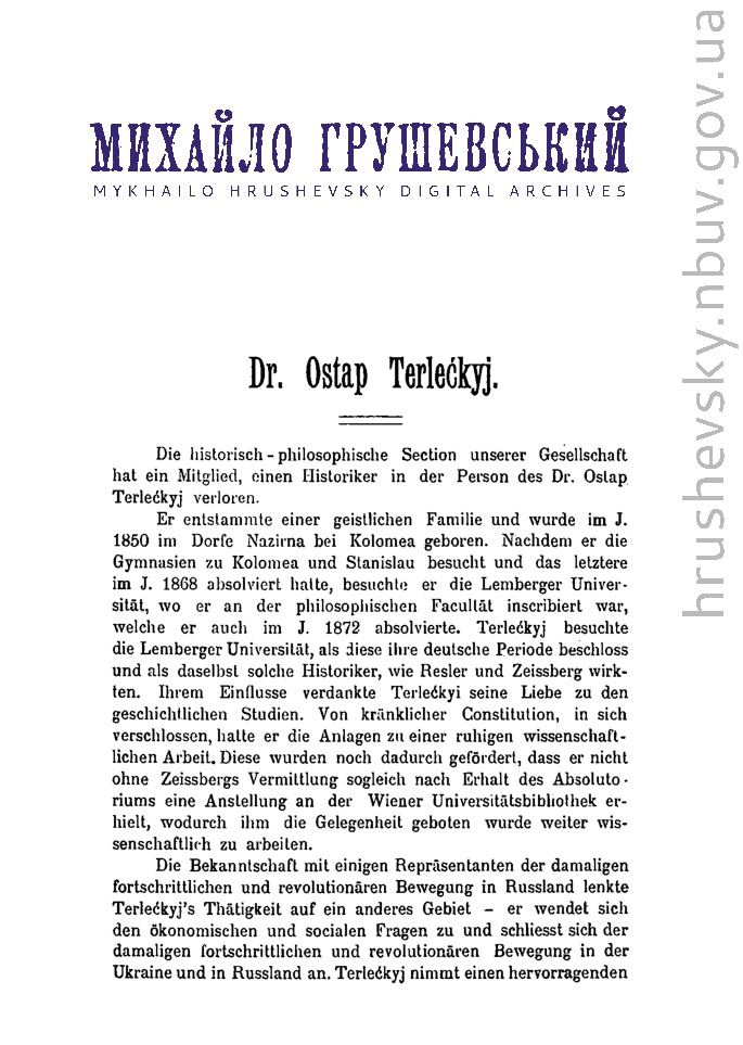 | 1. |  | [Hruševskyj M.] Dr. Ostap Terlećkyj: [Nachruf] // Chronik der Ukrainischen Ševčenko-Gesellschaft der Wissenschaften in Lemberg : Druck. der Ševčenko-Gesellschaft der Wissenschaften, 1903. - № 13 (нім. мовою) : Jhgg. 1903. Heft I. - С. S. 21–24 |  Бібліотека  |