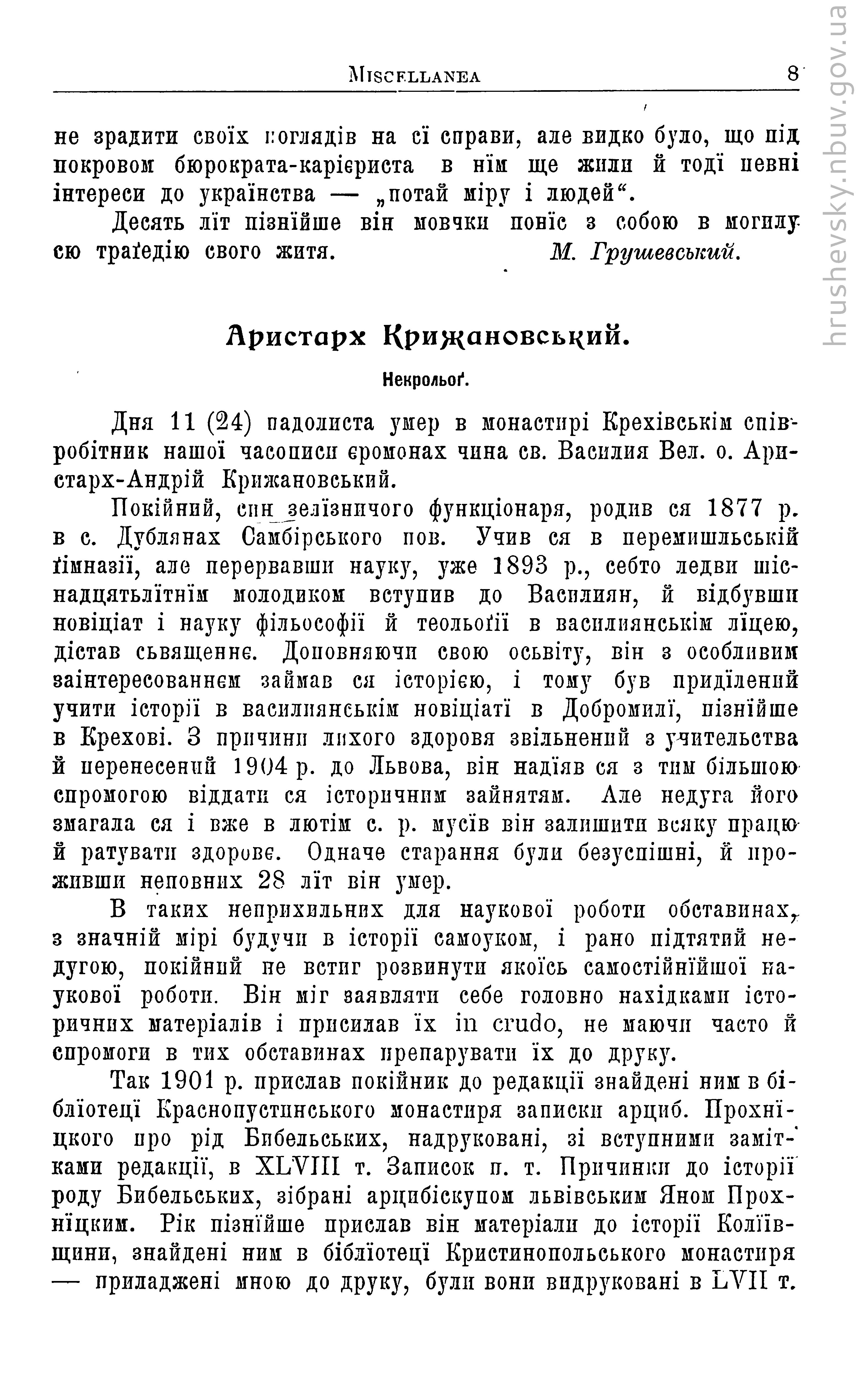 | 5. |  | Грушевський М. Аристарх Крижановський (некролог) // Записки товариства імені Шевченка : вид-во, присвяч. науці і письменству укр.-рус. народу. - Львів : Накладом Т-ва імені Шевченка, 1905. - Т. 68, кн. 6. - С. 8-9 [115] |  Бібліотека  |