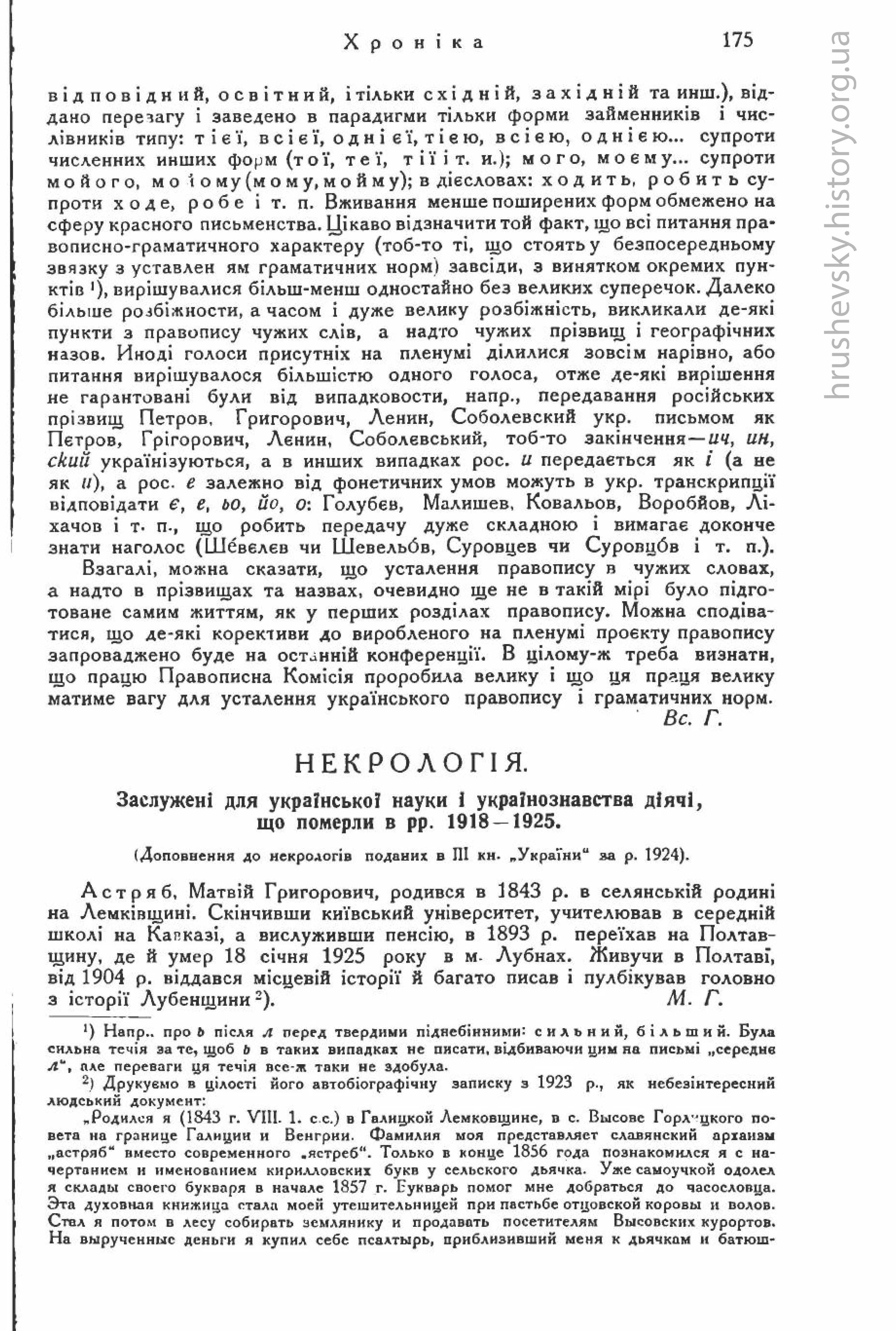 | 7. |  | Грушевський Михайло Сергійович Астряб, Матвій Григорович: [некролог] // Україна : Науковий двохмісячник українознавства : Орган Історичної секції Академії (б. Українського Наукового Товариства в Київі) : Державне видавництво України, 1925. - Кн. 6 (15). - С. 175 |  Бібліотека  |
