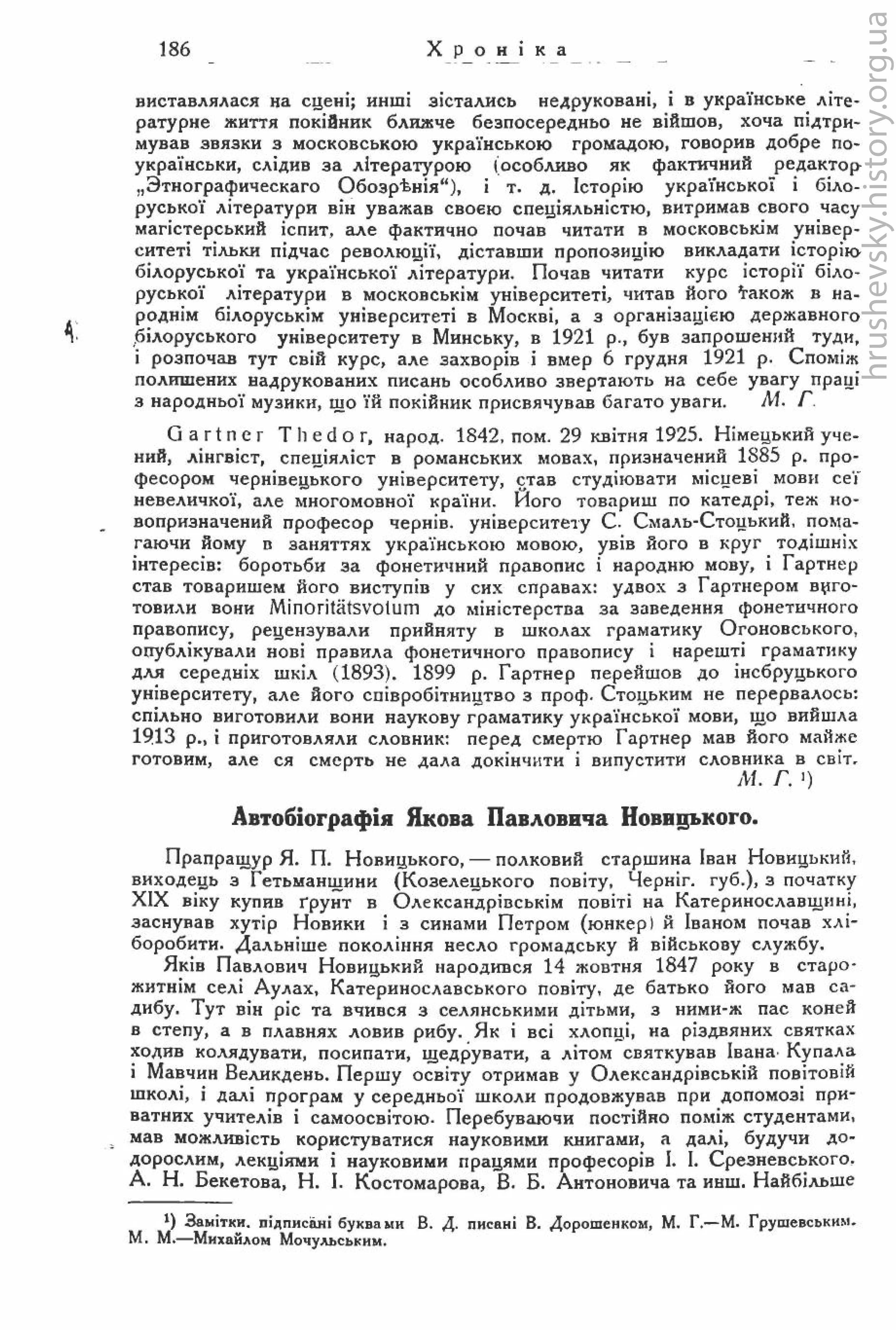 | 2. |  | Грушевський Михайло Сергійович Gartner Theodor: [некролог] // Україна : Науковий двохмісячник українознавства : Орган Історичної секції Академії (б. Українського Наукового Товариства в Київі) : Державне видавництво України, 1925. - Кн. 6 (15). - С. 186 |  Бібліотека  |