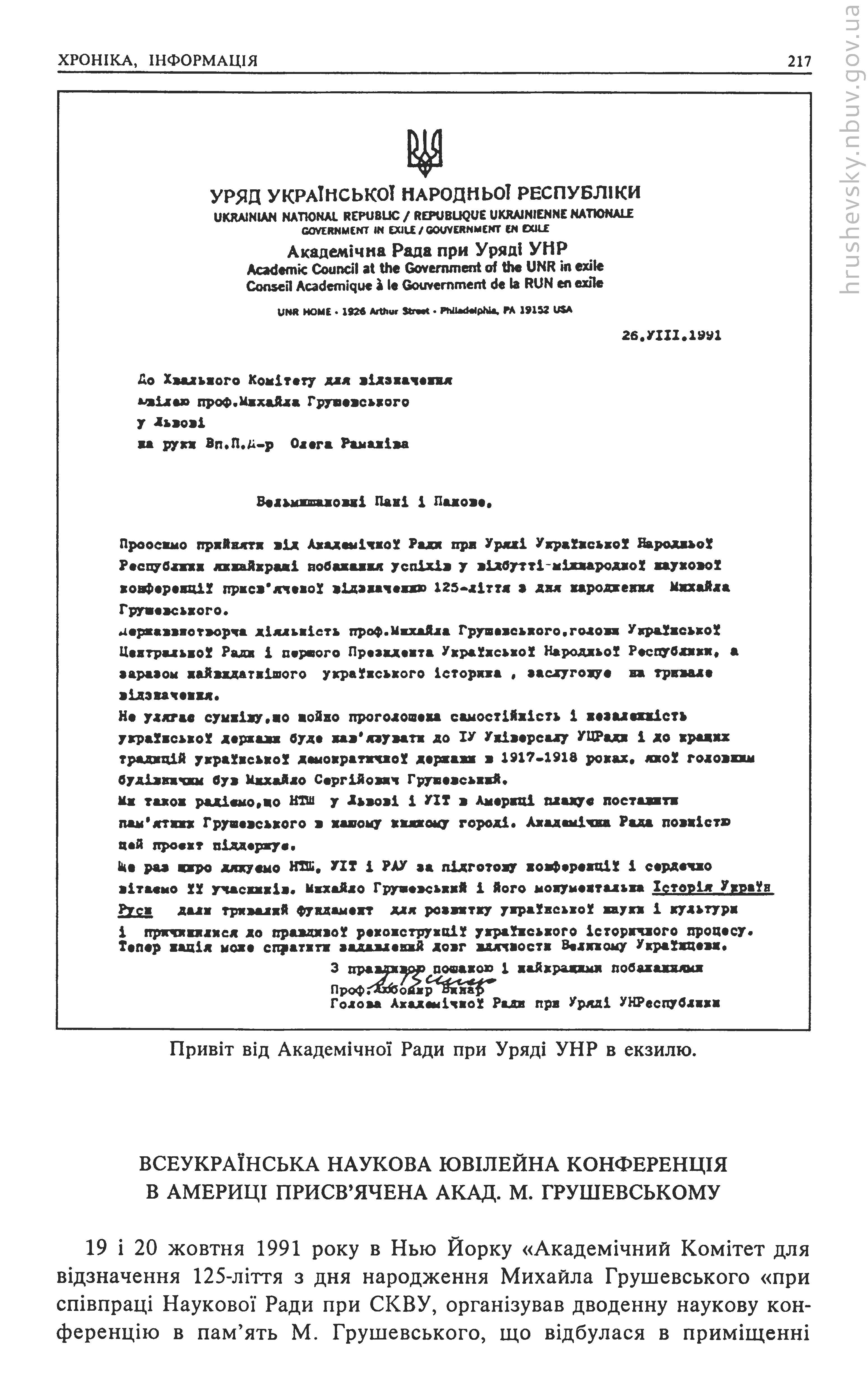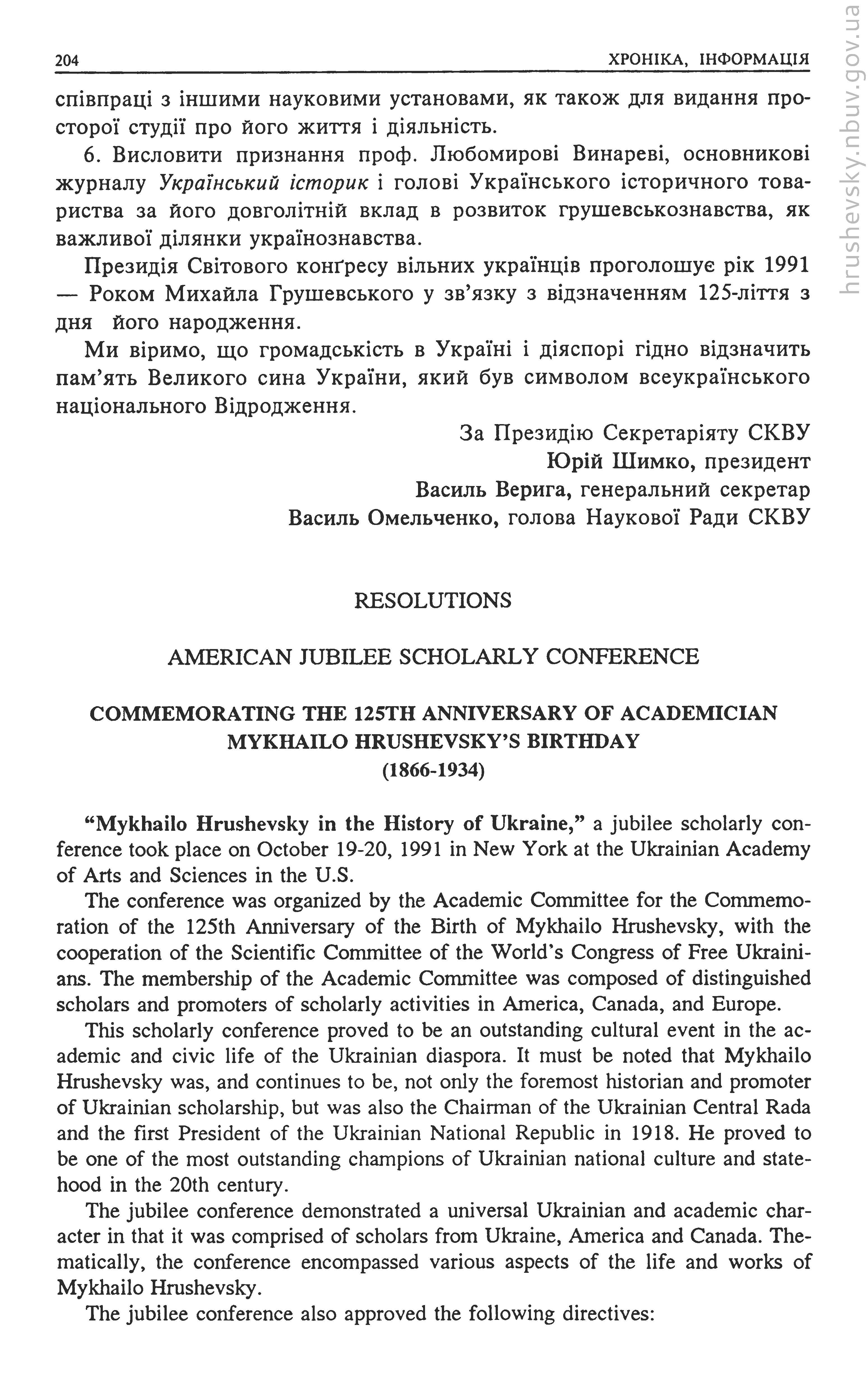 | 4. |  | Commemorating the 125th Anniversary of Academician Mykhailo Hrushevsky’s Birthday (1866–1934) // Український історик : Українське історичне товариство, 1991. - Ч. 1–2 (108–109) : У 125-річчя народження Михайла Грушевського (1866–1991); століття поселення українців у Канаді (1891–1991). - С. 204–205 |  Бібліотека  |