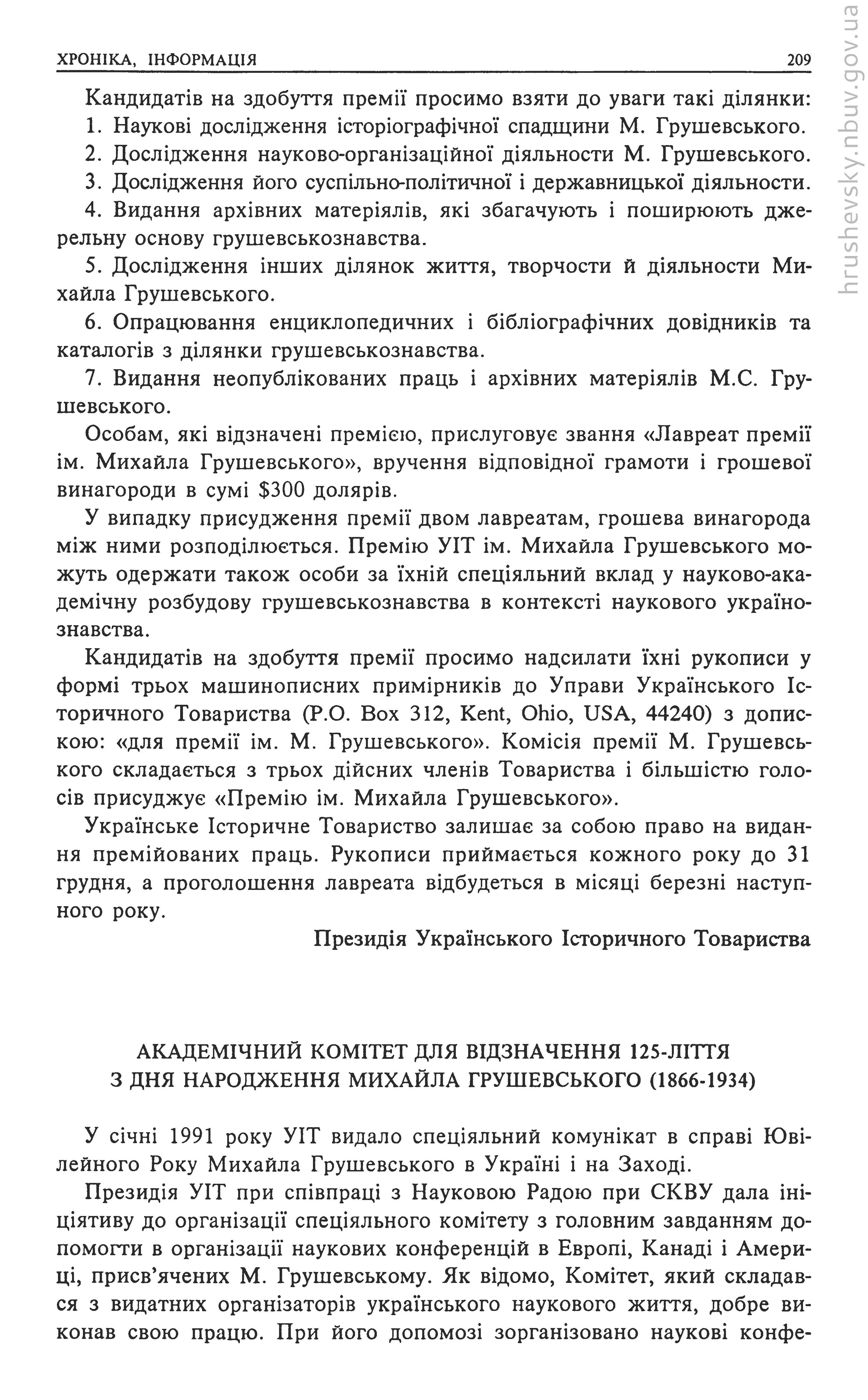 | 6. |  | Академічний комітет для відзначення 125-ліття з дня народження Михайла Грушевського (1866–1934) // Український історик : Українське історичне товариство, 1991. - Ч. 1–2 (108–109) : У 125-річчя народження Михайла Грушевського (1866–1991); століття поселення українців у Канаді (1891–1991). - С. 209–210 |  Бібліотека  |
