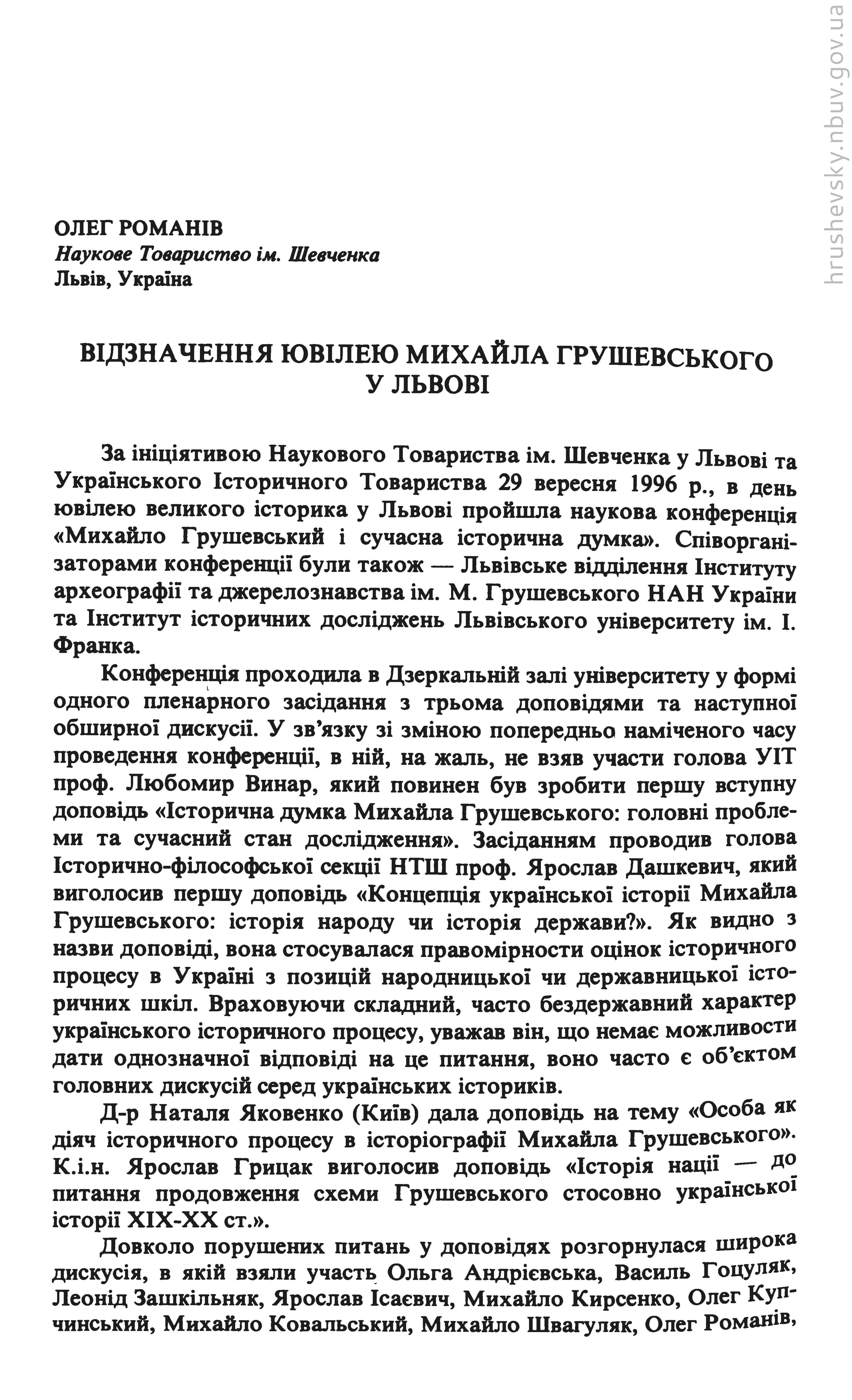 | 9. |  | Романів Олег Відзначення Ювілею Михайла Грушевського у Львові // Український історик : Українське історичне товариство, 1996. - Ч. 1–4 (128–131) : Михайло Грушевський. Студії і матеріали. З нагоди 130-річчя від дня народження (1866–1996): Ювілейне видання. - С. 414–416 |  Бібліотека  |