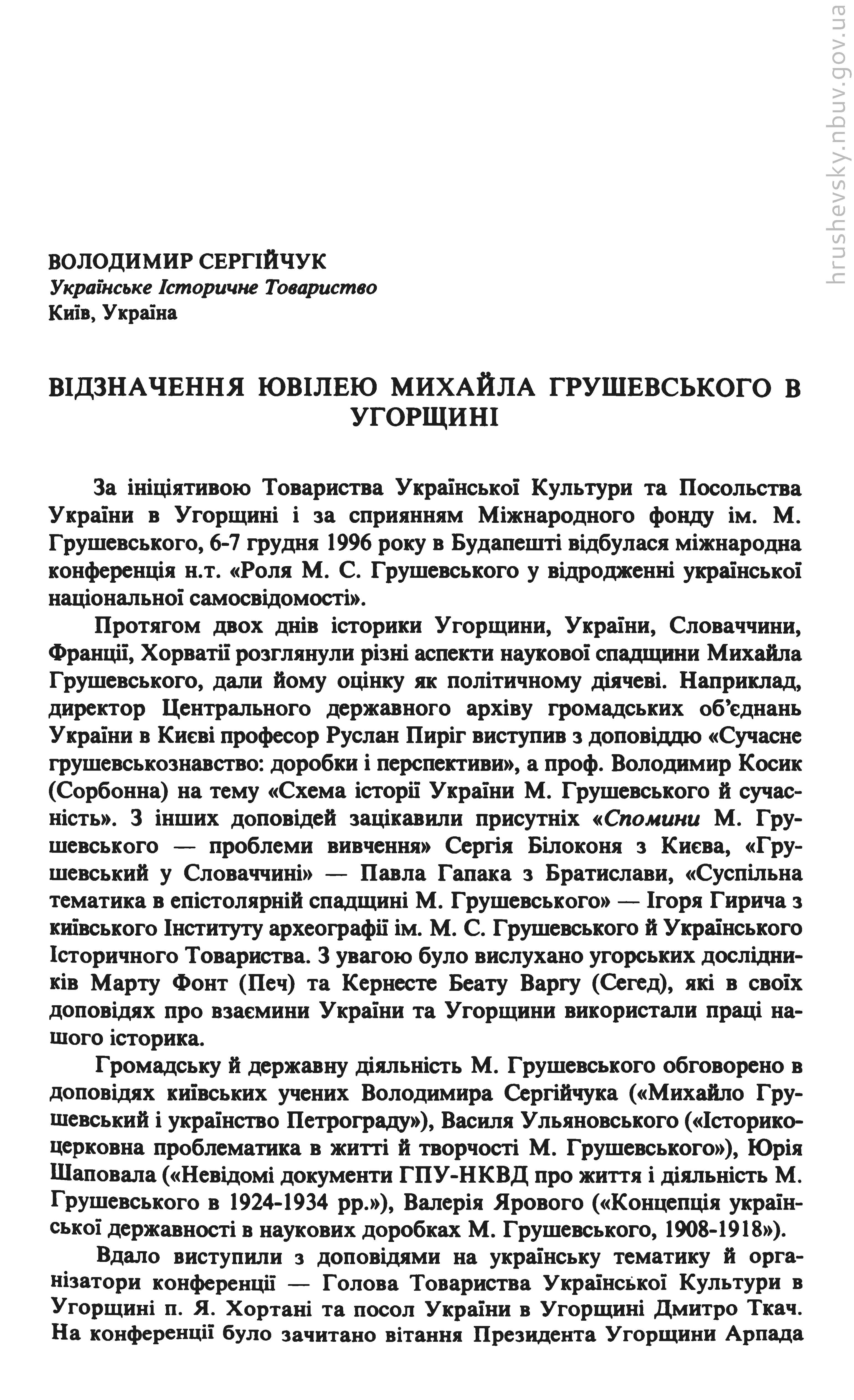 | 8. |  | Сергійчук Володимир Відзначення ювілею Михайла Грушевського в Угорщині // Український історик : Українське історичне товариство, 1996. - Ч. 1–4 (128–131) : Михайло Грушевський. Студії і матеріали. З нагоди 130-річчя від дня народження (1866–1996): Ювілейне видання. - С. 427–428 |  Бібліотека  |