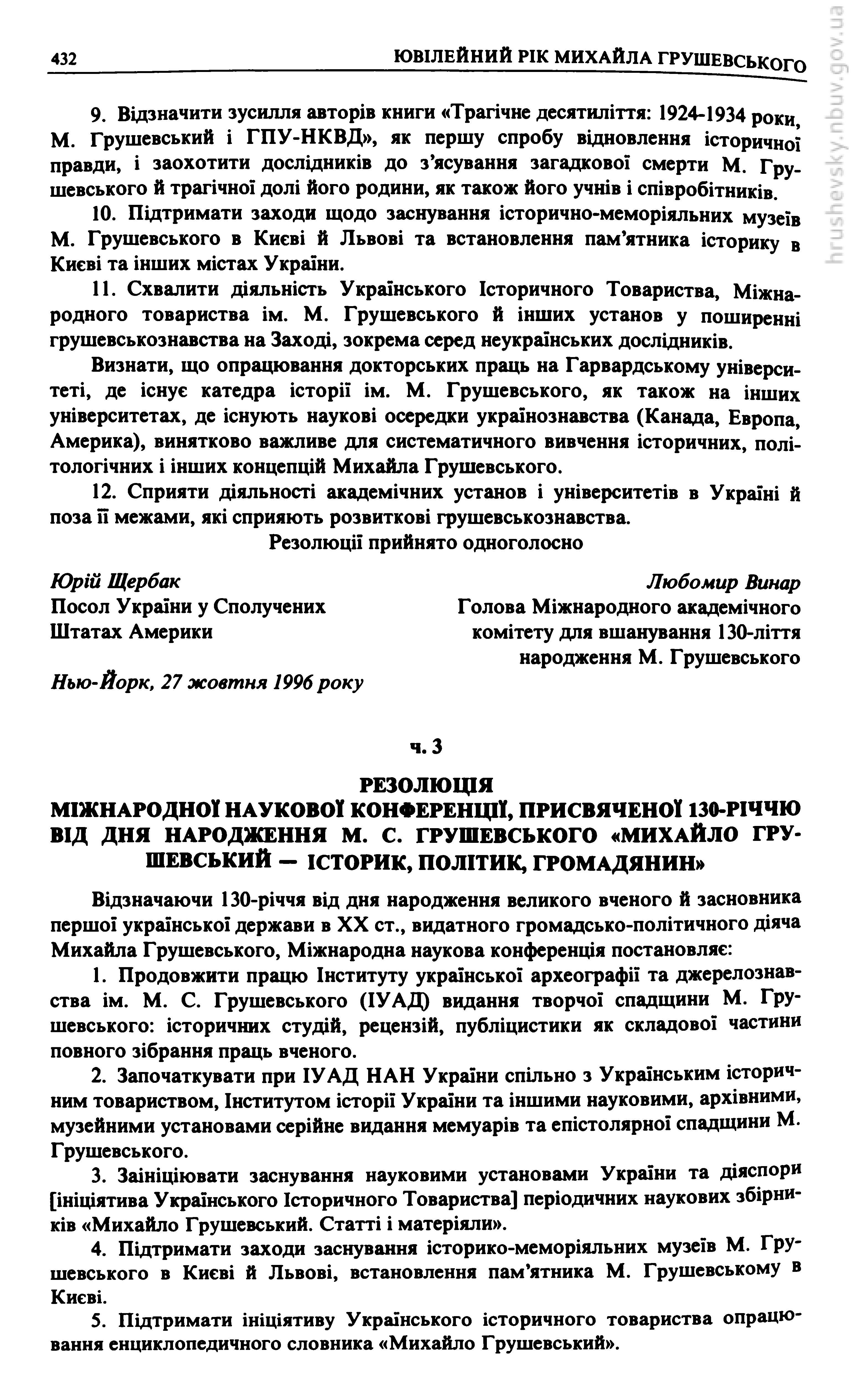 | 1. |  | 2. Резолюція Ювілейної Наукової конференції в Нью-Йорку, присвяченої 130-ій річниці від дня народження М. Грушевського // Український історик : Українське історичне товариство, 1996. - Ч. 1–4 (128–131) : Михайло Грушевський. Студії і матеріали. З нагоди 130-річчя від дня народження (1866–1996): Ювілейне видання. - С. 430–432 |  Бібліотека  |