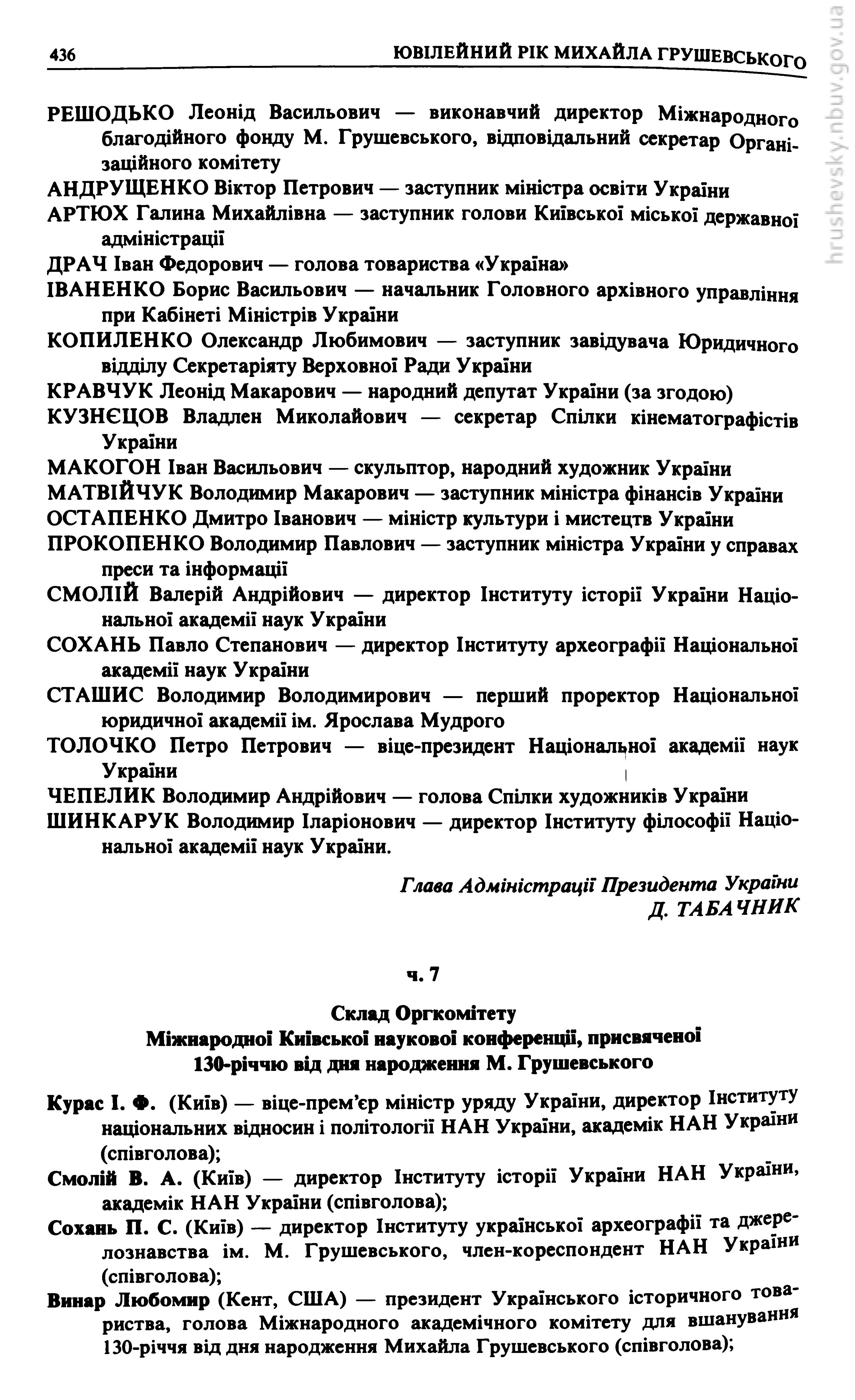 | 3. |  | 7. Склад оргкомітету Міжнародної наукової конференції в Києві, присвяченої 130-річчю від дня народження М. C. Грушевського // Український історик : Українське історичне товариство, 1996. - Ч. 1–4 (128–131) : Михайло Грушевський. Студії і матеріали. З нагоди 130-річчя від дня народження (1866–1996): Ювілейне видання. - С. 436–437 |  Бібліотека  |