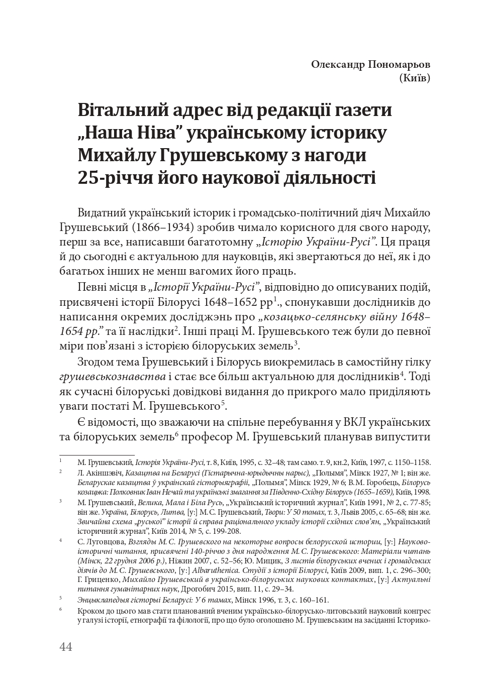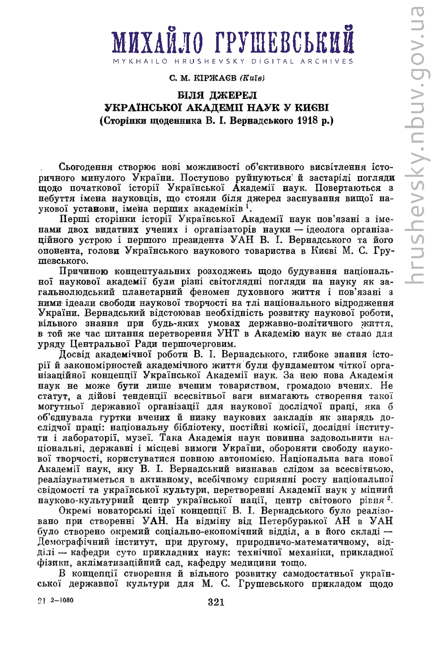 | 6. |  | Кіржаєв С. М. Біля джерел Української Академії наук у Києві (Сторінки щоденника В. І. Вернадського 1918 р.) // Український археографічний щорічник. - Київ : Наукова думка, 1992. - Нова серія. Вип. 1 (Український археографічний збірник. Т. 4). - С. 321-331 |  Бібліотека  | | 7. |  | Пономарьов О. Вітальний адрес від редакції газети "Наша Ніва” українському історику Михайлу Грушевському з нагоди 25-річчя його наукової діяльності // Rocznik Centrum Studiów Białoruskich / Гадавік Цэнтра беларускіх Студыяў/ Uniwersytet Warszawski, Studium Europy Wschodniej, Centrum Studiów Białoruskich. - Варшава, 2018. - № 4. - С. 44–55 |  Бібліотека  | | 8. |  | ВОЛОДИМИР ІВАНОВИЧ ВЕРНАДСЬКИЙ. ЛИСТУВАННЯ З УКРАЇНСЬКИМИ ВЧЕНИМИ.- Кн. 1 : Листування: А - Г (2011)