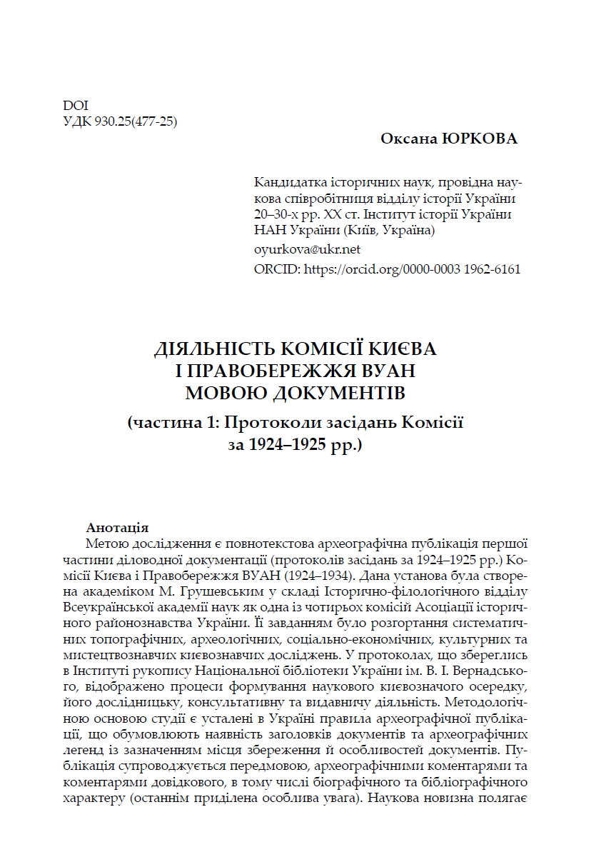 | 10. |  | Юркова О. Діяльність Комісії Києва і Правобережжя ВУАН мовою документів (частина 1: Протоколи засідань Комісії за 1924–1925 рр.) // Київські збірники історії, археології, мистецтва та побуту. - Київ : КЗ "Центр консервації предметів археології", Видавець Олександр Савчук, 2021. - Збірник 2 . - С. 19–73 |  Бібліотека